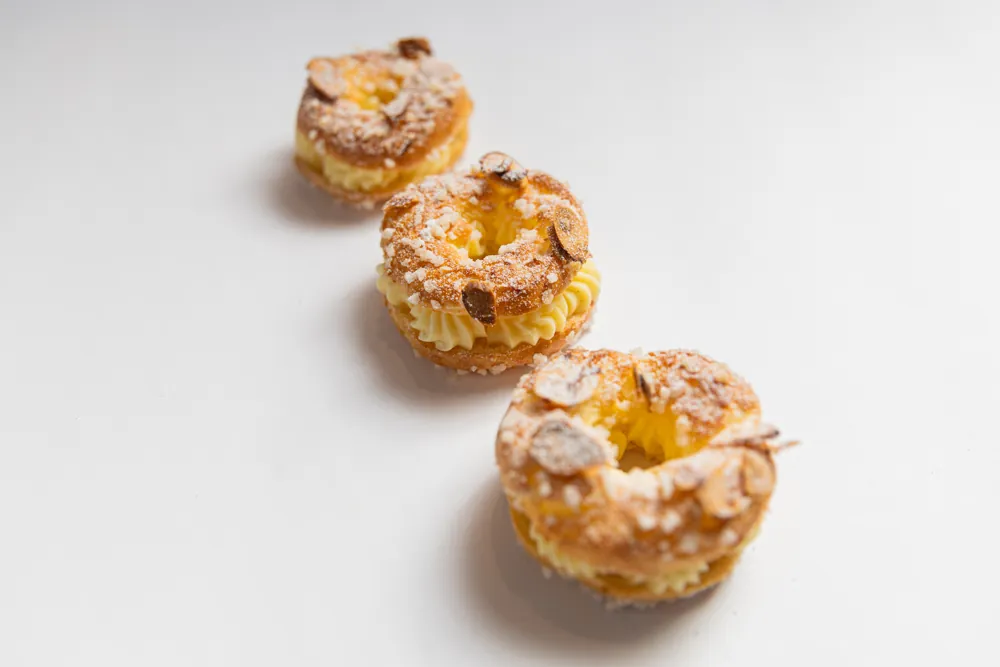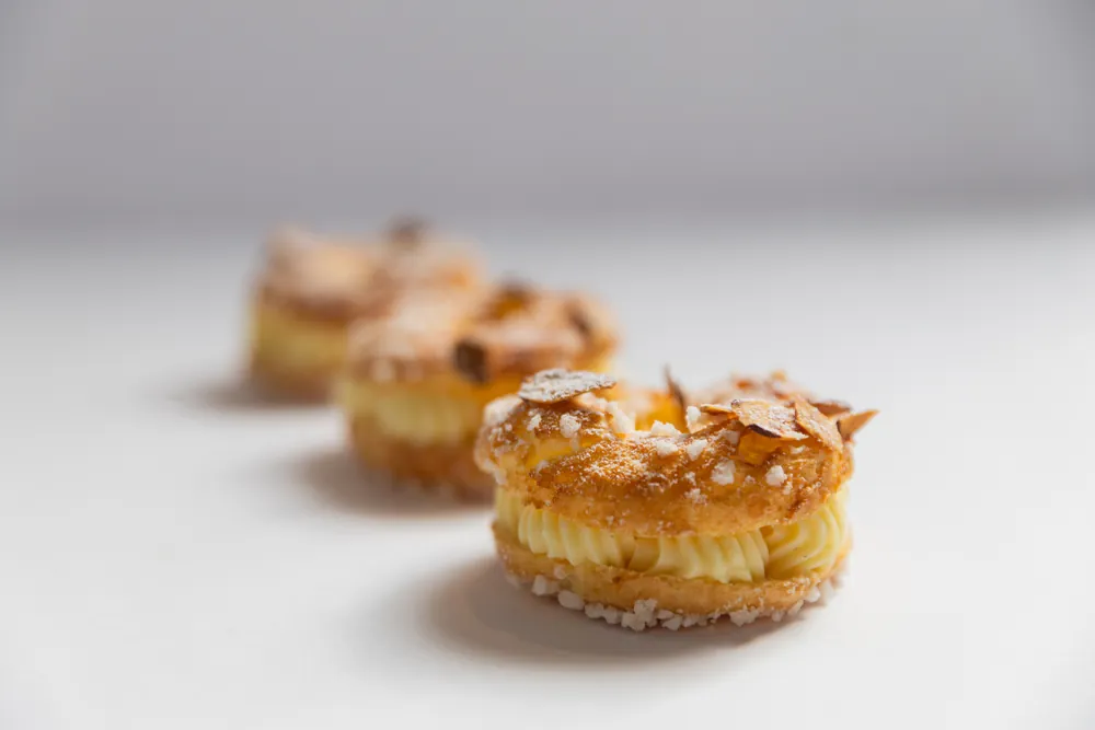 Creamy pastry custard with a nutty flavor topped with sliced almonds